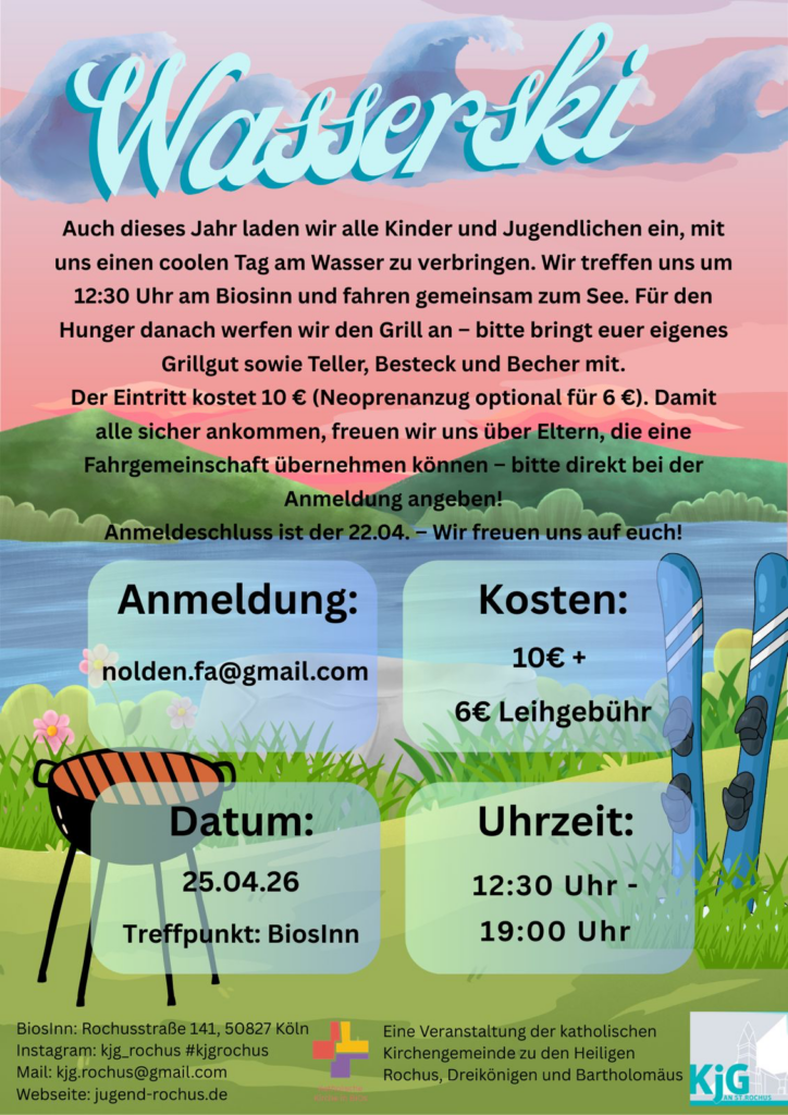 Wie auch die letzten Jahre wollen wir mit euch Wasserski fahren gehen. Am 25.04.26 erwartet euch ein sportlicher Tag voller Aktion und Spaß auf dem Wasser.